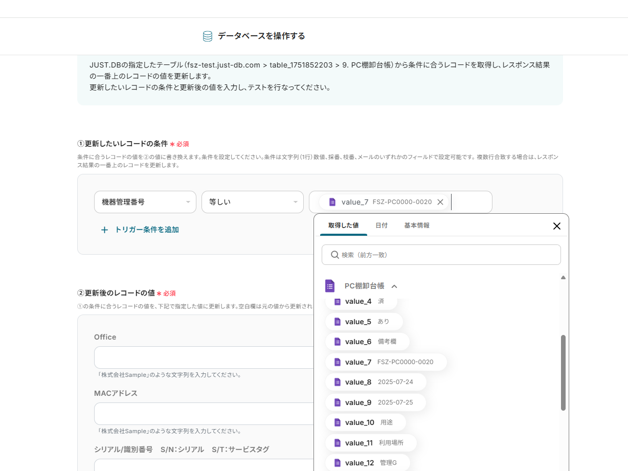 JUST.DBに登録されている機器管理番号と、Googleフォームから取得した危機管理番号が等しい場合に、そのデータが更新されるように設定します。