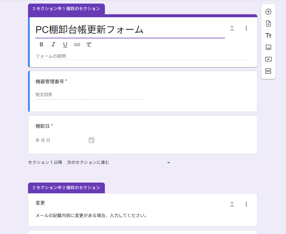 機器管理番号の他にフォームには以下の項目を設置しました。