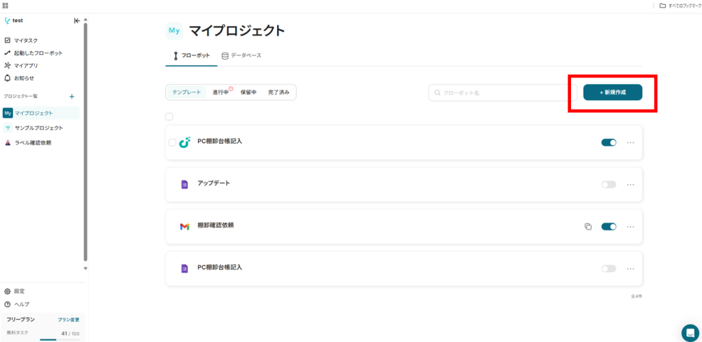 Yoomのページを開いたら、画面右上にある「新規作成」をクリックします。