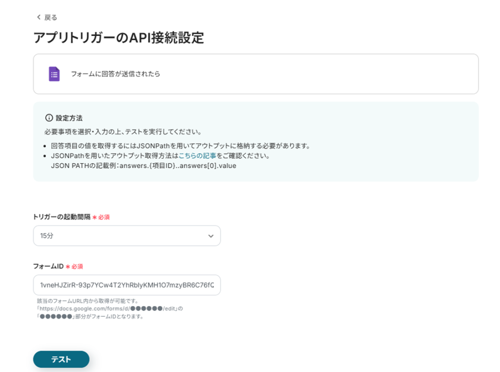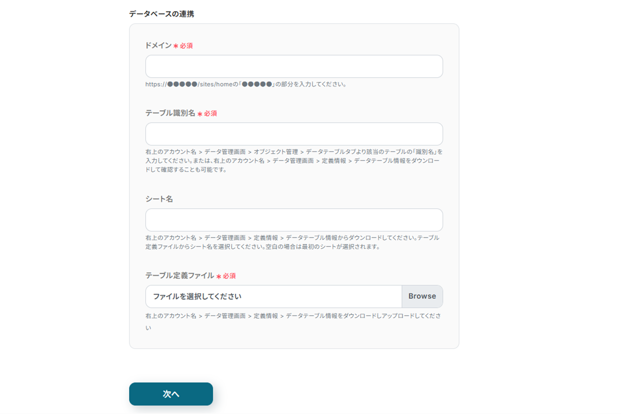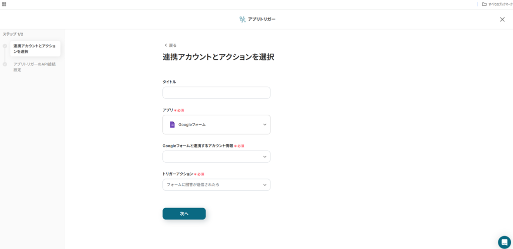次にアプリトリガーページが表示されます。Googleフォームと連携するアカウント情報を追加し、「次へ」を押下してください。