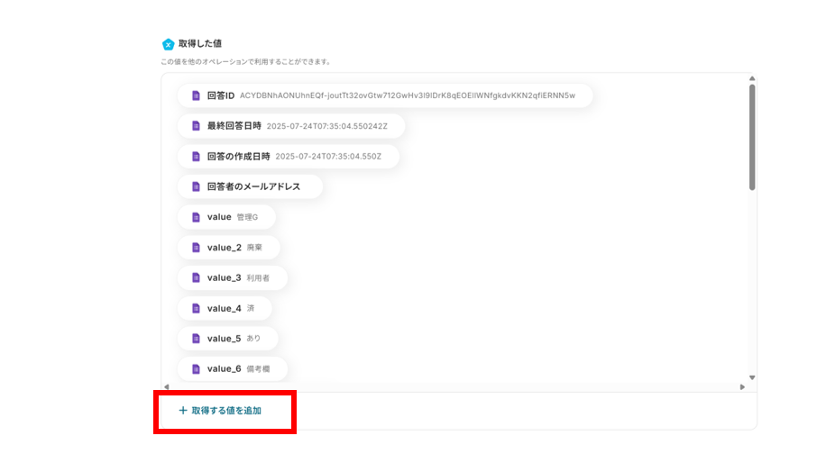 Googleフォームに入力されたデータを取得するために、「取得する値を追加」を押下します。