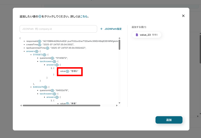 ホームで回答した値の+をクリックすると右側に表示されます。すべて取得後「追加」を押下します。