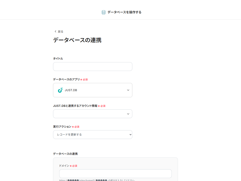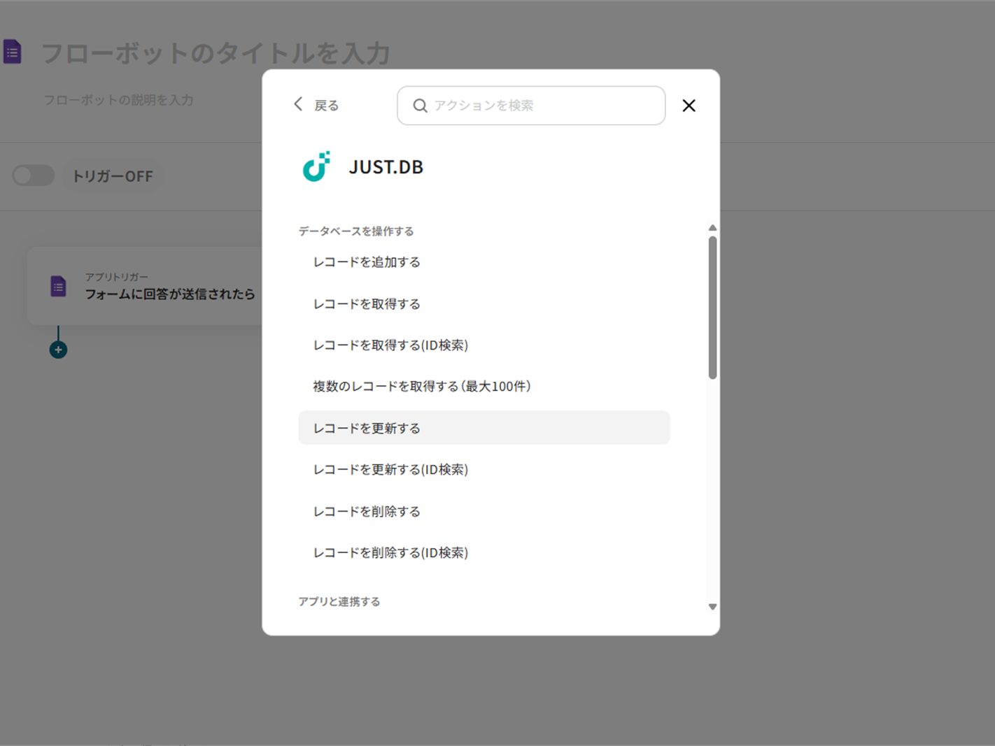 次にデータベースの操作を選択します。今回はレコードを更新するを選択します。