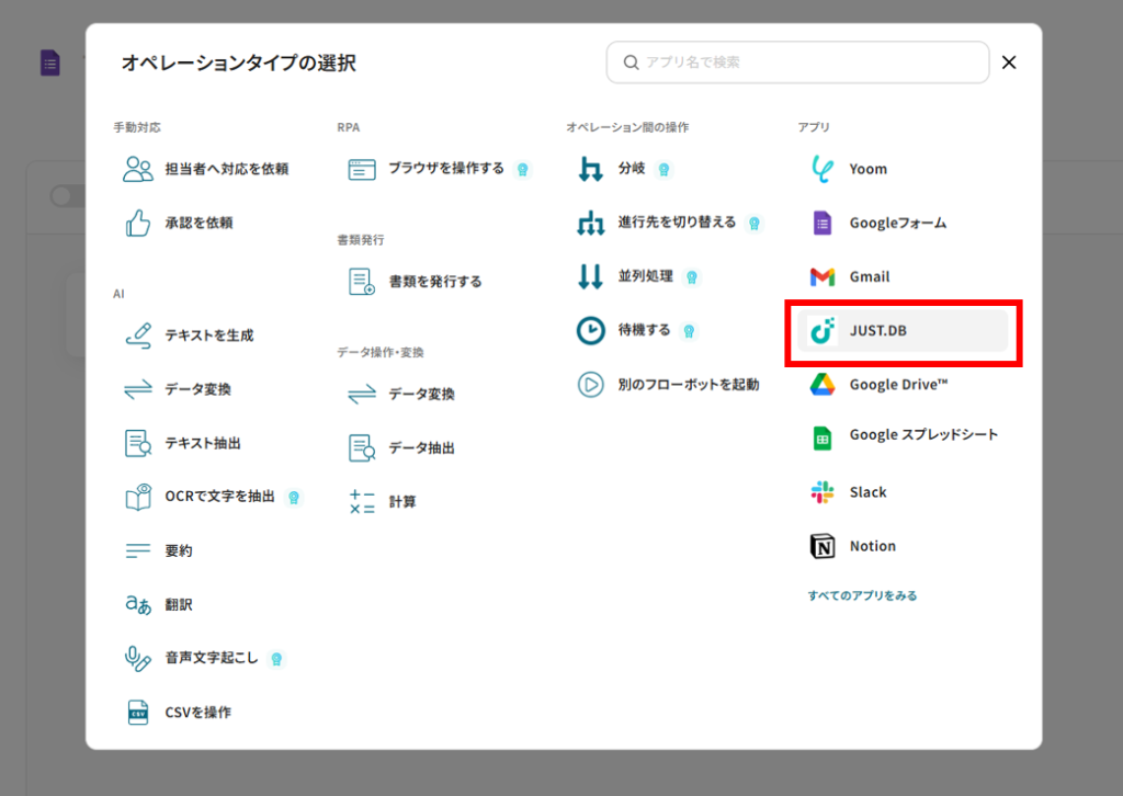 オペレーションタイプの選択画面に移動します。今回は「JUST.DB」を選択します。