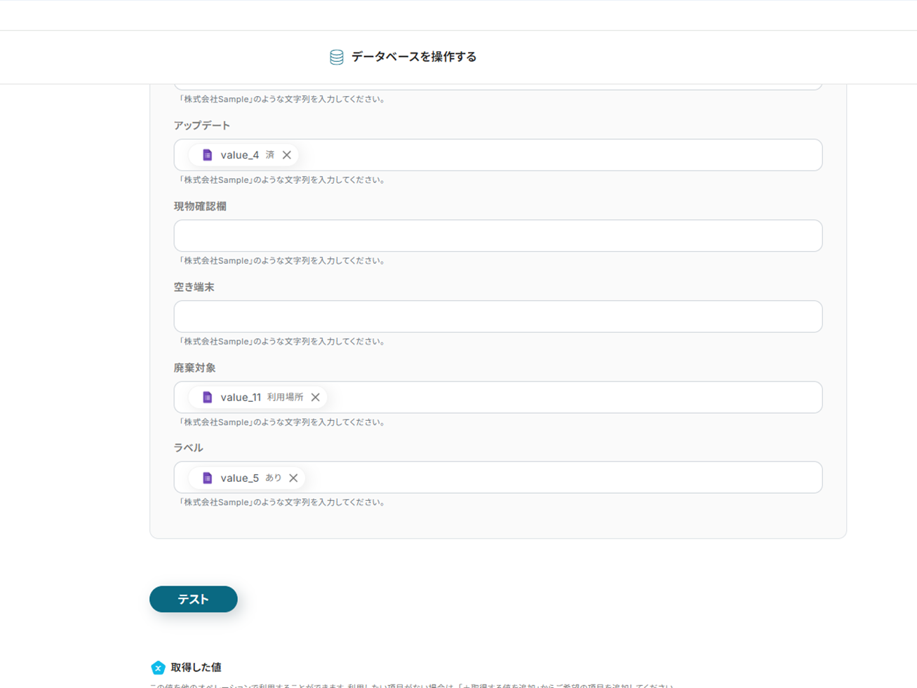 マッピング完了後「テスト」を押下し、データが正しく更新されてるか確認します。