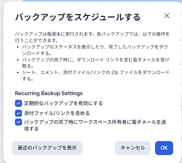 ワークスペースの定期バックアップでは、所有者または管理者である必要があります。